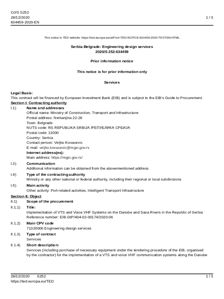 OJ/S S252 28/12/2020 6344592020EN1/3This notice in TED website: https://ted.europa.eu/udl?uriTED:NOTICE:6344592020:TEXT:EN:HTMLSerbiaBelgrade: Engineering design services 2020/S 252634459 Prior information