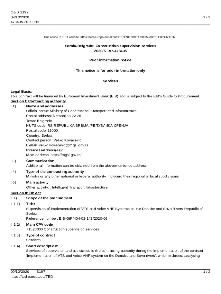 OJ/S S197 09/10/2020 4734052020EN1/2This notice in TED website: https://ted.europa.eu/udl?uriTED:NOTICE:4734052020:TEXT:EN:HTMLSerbiaBelgrade: Construction supervision services 2020/S 197473405 Prior