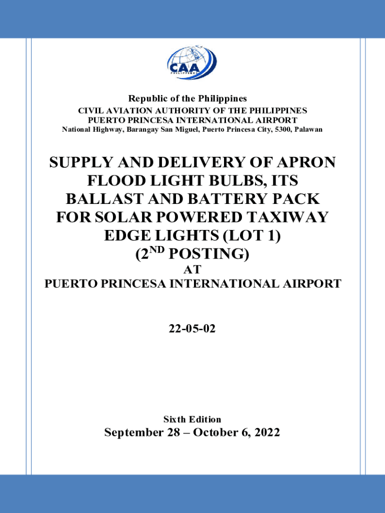 Republic of the PhilippinesCIVIL AVIATION AUTHORITY OF THE PHILIPPINES PUERTO PRINCES INTERNATIONAL AIRPORTNational Highway, Barangay San Miguel, Puerto Princes City, 5300, PalawanSUPPLY AND DELIVERY