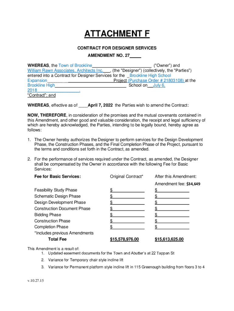 ATTACHMENT F CONTRACT FOR DESIGNER SERVICES AMENDMENT NO. 27 WHEREAS, the Town of Brookline (Owner) and William Ran Associates, Architects Inc., (the Designer) (collectively, the Parties) entered