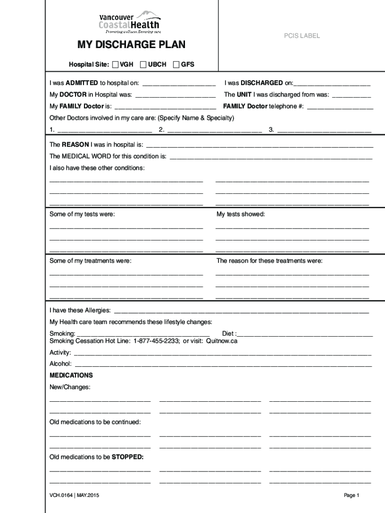 PCI LABEL MY DISCHARGE PLAN Hospital Site: GH BCH FSI was ADMITTED to hospital on: ___I was DISCHARGED on:___My DOCTOR in Hospital was: ___The UNIT I was discharged from was: ___My FAMILY Doctor is: