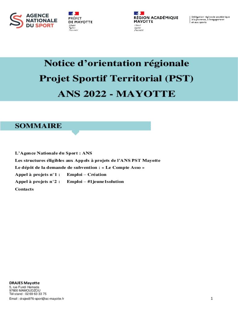 Noticed orientation regional Project Sport if Territorial (PST) ANS 2022 MAYOTTESOMMAIRELAgence National Du Sport : ANS Les structures eligible aux Appeals projects DE land PST Mayotte Le dpt DE la