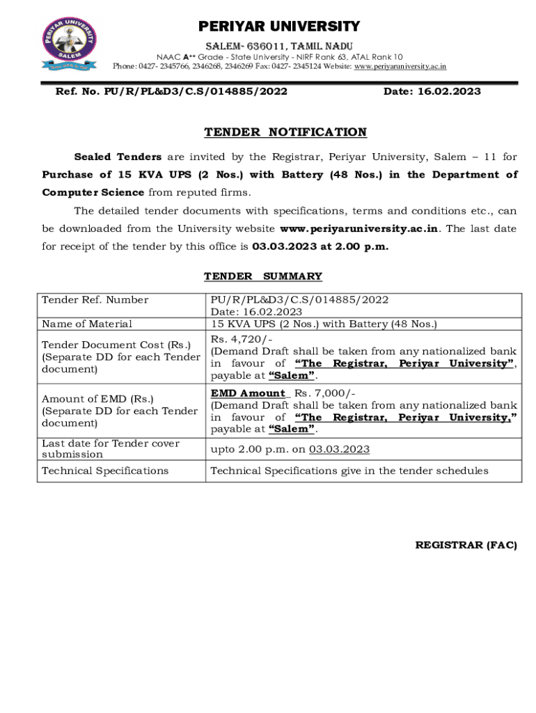 PRIYA UNIVERSITY Salem 636011, Tamil Nadu NAACP A++ Grade State University NIR Rank 63, FATAL Rank 10 Phone: 0427 2345766, 2346268, 2346269 Fax: 0427 2345124 Website: www.periyaruniversity.ac.inRef.