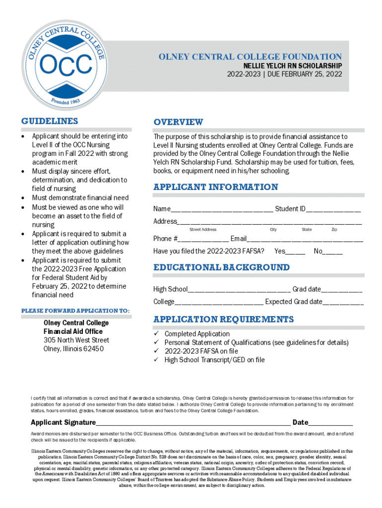 OLNEY CENTRAL COLLEGE FOUNDATION NELLIE BELCH RN SCHOLARSHIP 20222023 | DUE FEBRUARY 25, 2022GUIDELINESOVERVIEWThe purpose of this scholarship is to provide financial assistance to Level II Nursing