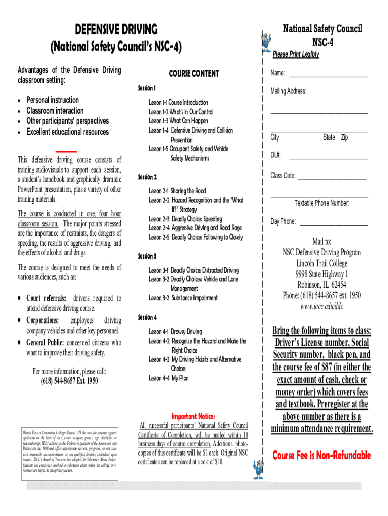 Register for the NSC Defensive Driving Safety course online or by phone.