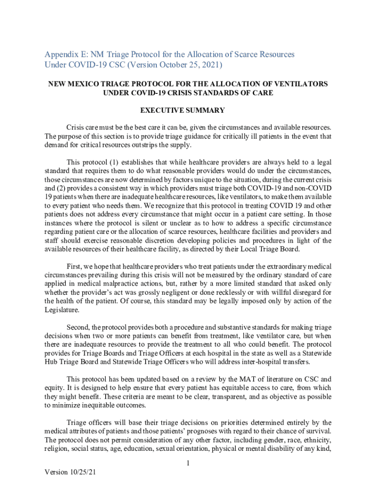 Appendix E: NM Triage Protocol for the Allocation of Scarce Resources Under COVID-19 CSC (Version October 25, 2021) NEW MEXICO TRIAGE PROTOCOL FOR THE ALLOCATION OF VENTILATORS UNDER COVID-19 CRISIS