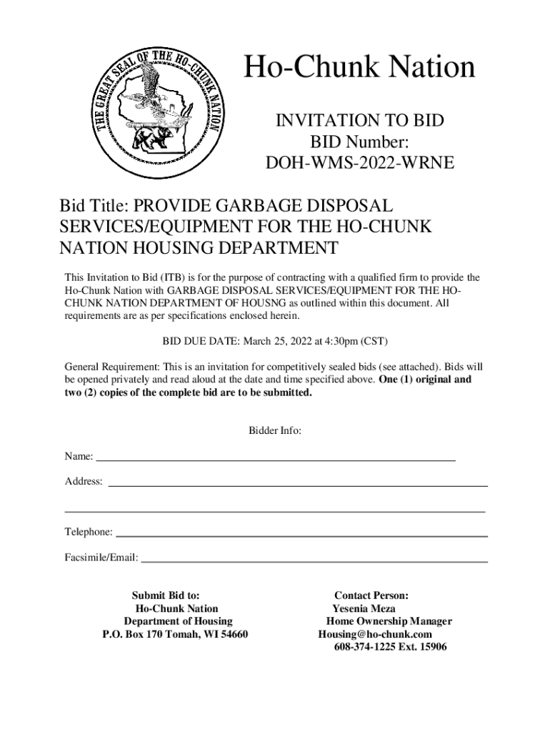 Ho Chunk Nation INVITATION TO BID Number: DOHWMS2022WRNE Bid Title: PROVIDE GARBAGE DISPOSAL SERVICES/EQUIPMENT FOR THE CHUNK NATION HOUSING DEPARTMENT This Invitation to Bid (ITB) is for the purpose