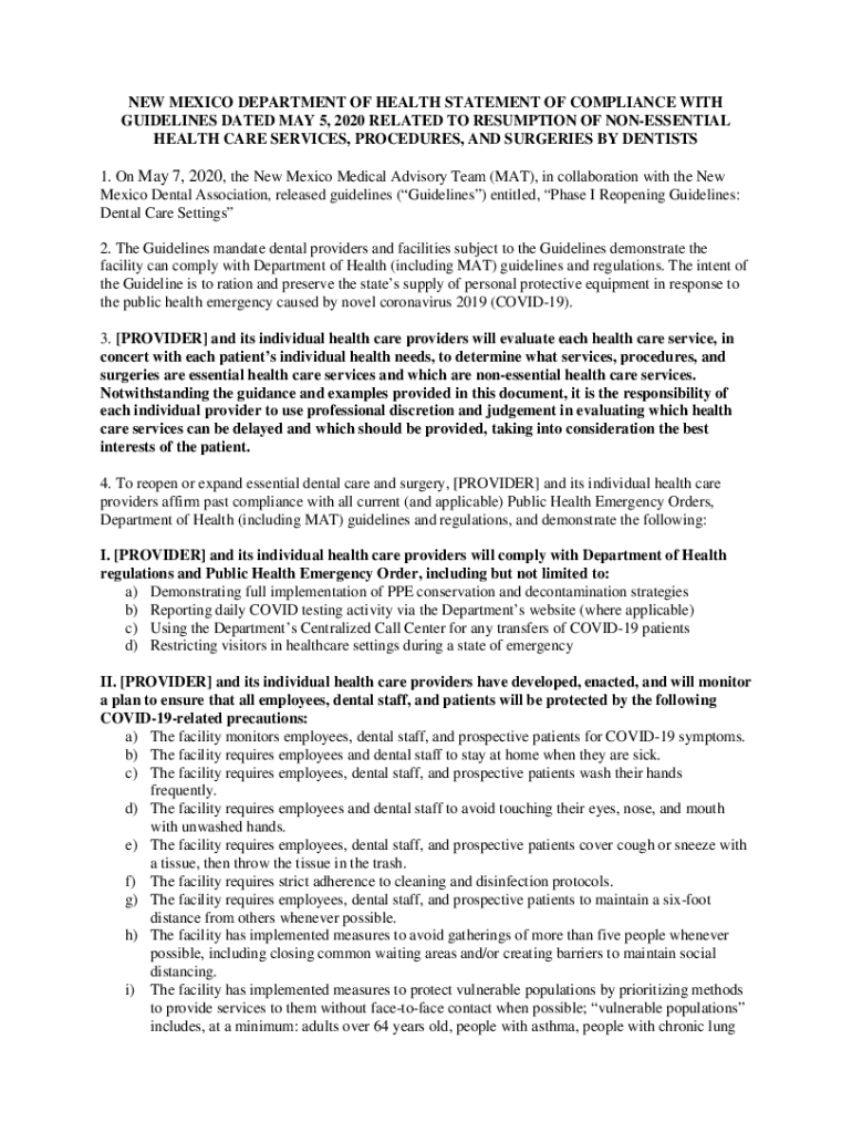 NEW MEXICO DEPARTMENT OF HEALTH STATEMENT OF COMPLIANCE WITH GUIDELINES DATED MAY 5, 2020, RELATED TO RESUMPTION OF NONESSENTIAL HEALTH CARE SERVICES, PROCEDURES, AND SURGERIES BY DENTISTS 1. On May