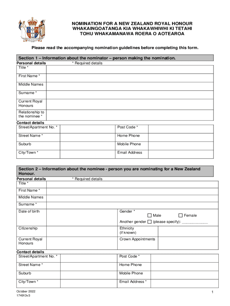 Get the free Nomination form for a New Zealand Royal Honour (October ...