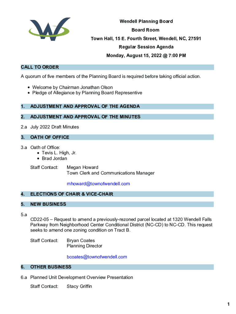 Wendell Planning Board Room Town Hall, 15 E. Fourth Street, Wendell, NC, 27591 Regular Session Agenda Monday, August 15, 2022 @ 7:00 PM CALL TO ORDER A quorum of five members of the Planning Board