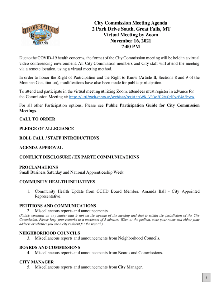 City Commission Meeting Agenda 2 Park Drive South, Great Falls, MT Virtual Meeting by Zoom November 16, 2021 7:00 PM Due to the COVID-19 health concerns, the format of the City Commission meeting