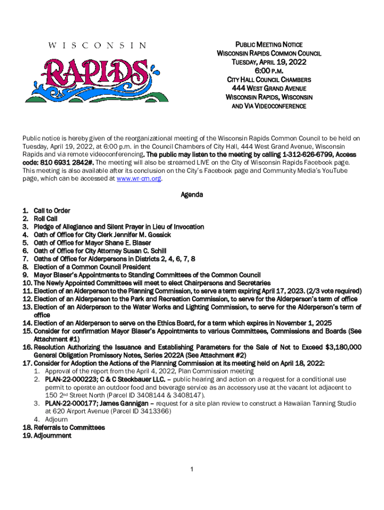 PUBLIC MEETING NOTICE WISCONSIN RAPIDS COMMON COUNCIL TUESDAY, APRIL 19, 2022 6:00 P.M. CITY HALL COUNCIL CHAMBERS 444 WEST GRAND AVENUE WISCONSIN RAPIDS, WISCONSIN AND VIA VIDEOCONFERENCEPublic notice