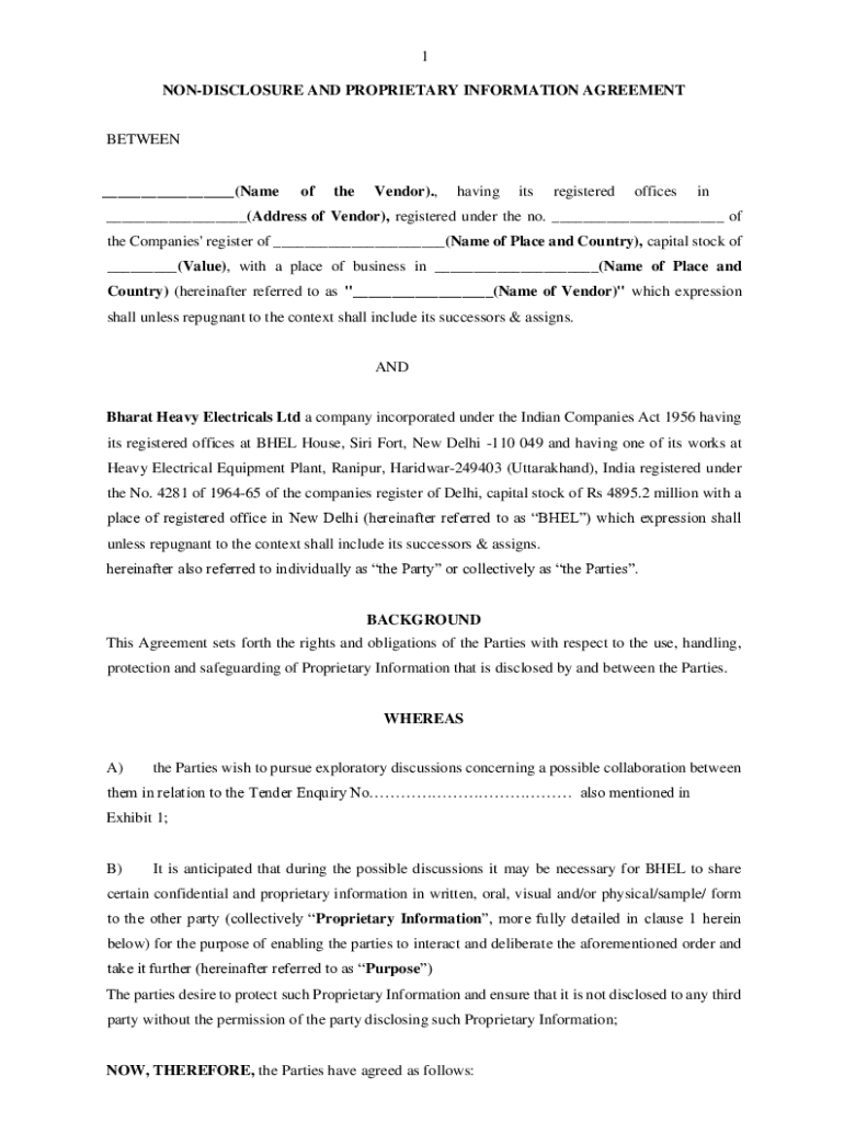 1 NONDISCLOSURE AND PROPRIETARY INFORMATION AGREEMENT BETWEEN___(NameoftheVendor)., havingitsregisteredofficesin___(Address of Vendor), registered under the no. ___ of the Companies\' register of