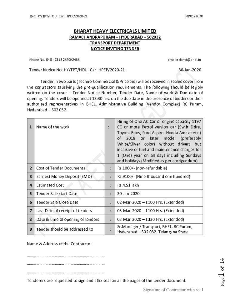 Ref: HY/TPT/YOU_Car_PEP/20202130/01/2020BHARAT HEAVY ELECTRICAL LIMITED