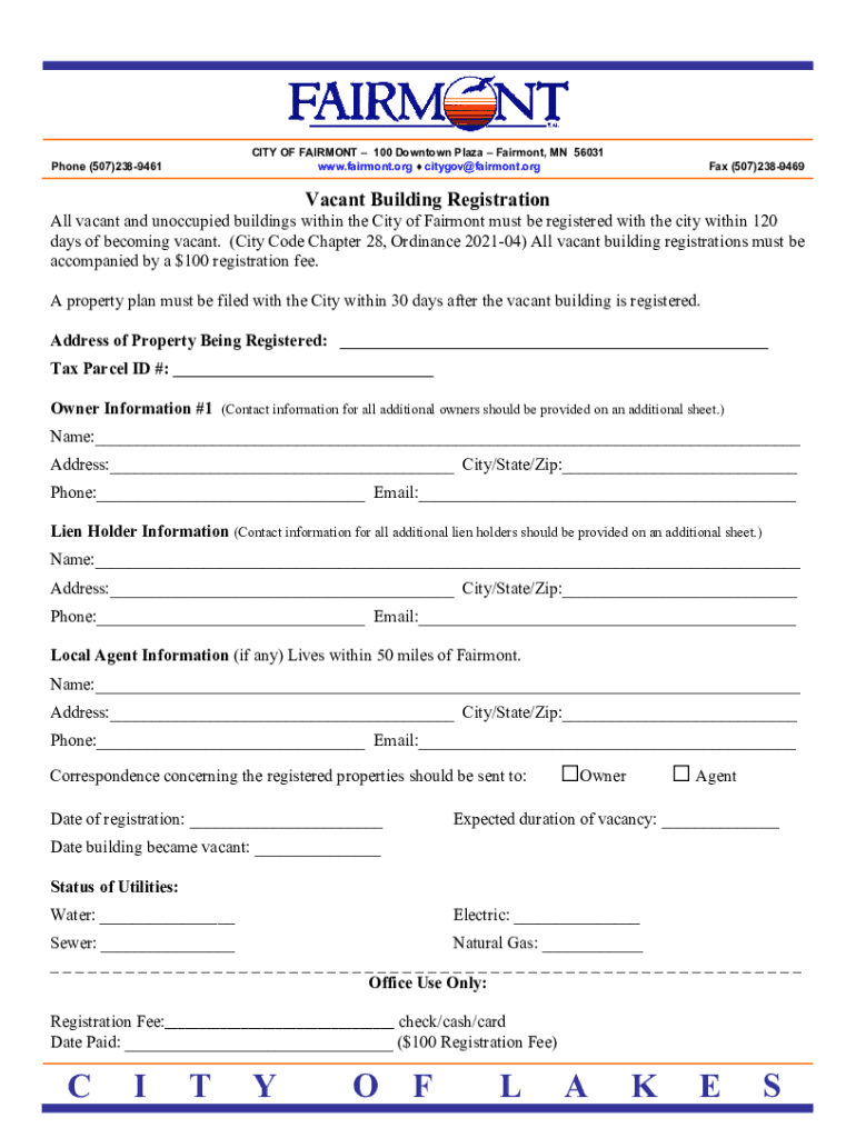 CITY OF FAIRMONT 100 Downtown Plaza Fairmont, MN 56031 www.fairmont.org citygov@fairmont.orgPhone (507)2389461Fax (507)2389469Vacant Building Registration vacant and unoccupied buildings within the