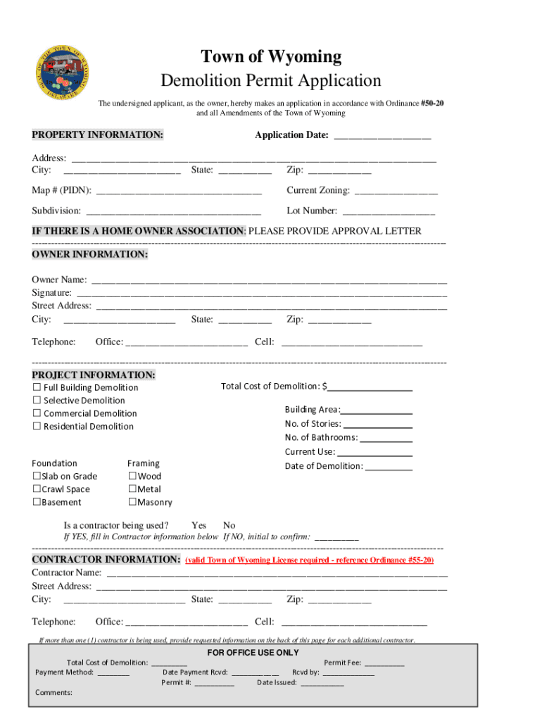 Town of Wyoming Demolition Permit Application The undersigned applicant, as the owner, hereby makes an application in accordance with Ordinance #5020 and all Amendments of the Town of WyomingPROPERTY