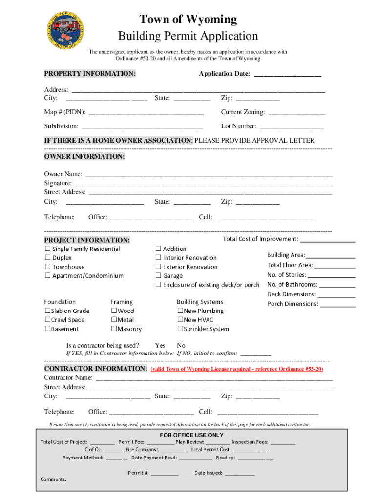 Town of Wyoming Building Permit Application The undersigned applicant, as the owner, hereby makes an application in accordance with Ordinance #5020 and all Amendments of the Town of WyomingPROPERTY