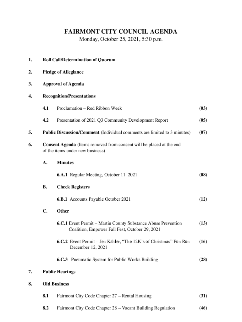 FAIRMONT CITY COUNCIL AGENDA Monday, October 25, 2021, 5:30 p.m.1. Roll Call/Determination of Quorum2. Pledge of Allegiance3. Approval of Agenda4. Recognition/Presentations 4.1Proclamation Red Ribbon