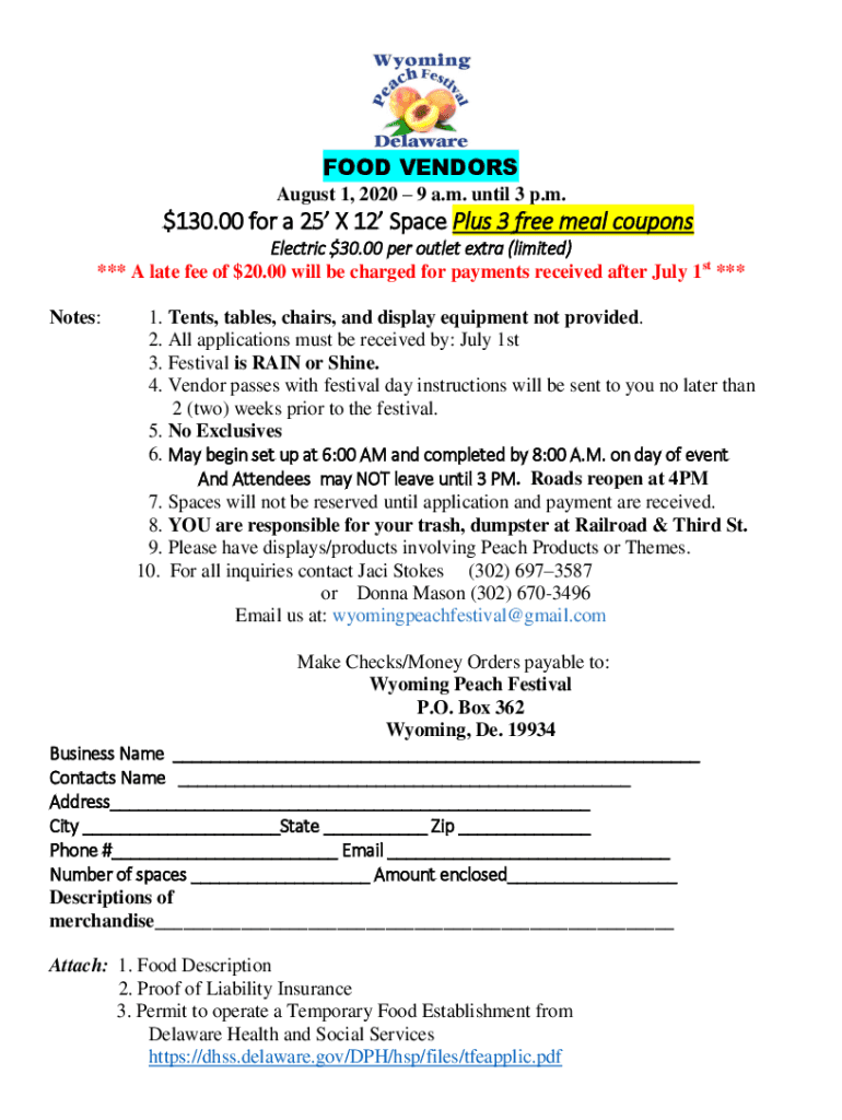 FOOD VENDORS August 1, 2020 9 a.m. until 3 p.m.$130.00 for a 25 × 12 Space Plus 3 free meal coupons Electric $30.00 per outlet extra (limited) *** A late fee of $20.00 will be charged for payments