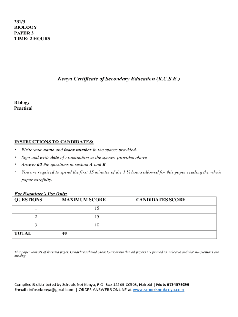 231/3 BIOLOGY PAPER 3 TIME: 2 HOURS Kenya Certificate of Secondary Education (K.C.S.E.) Biology PracticalINSTRUCTIONS TO CANDIDATES: Write your name and index number in the spaces provided. Sign and