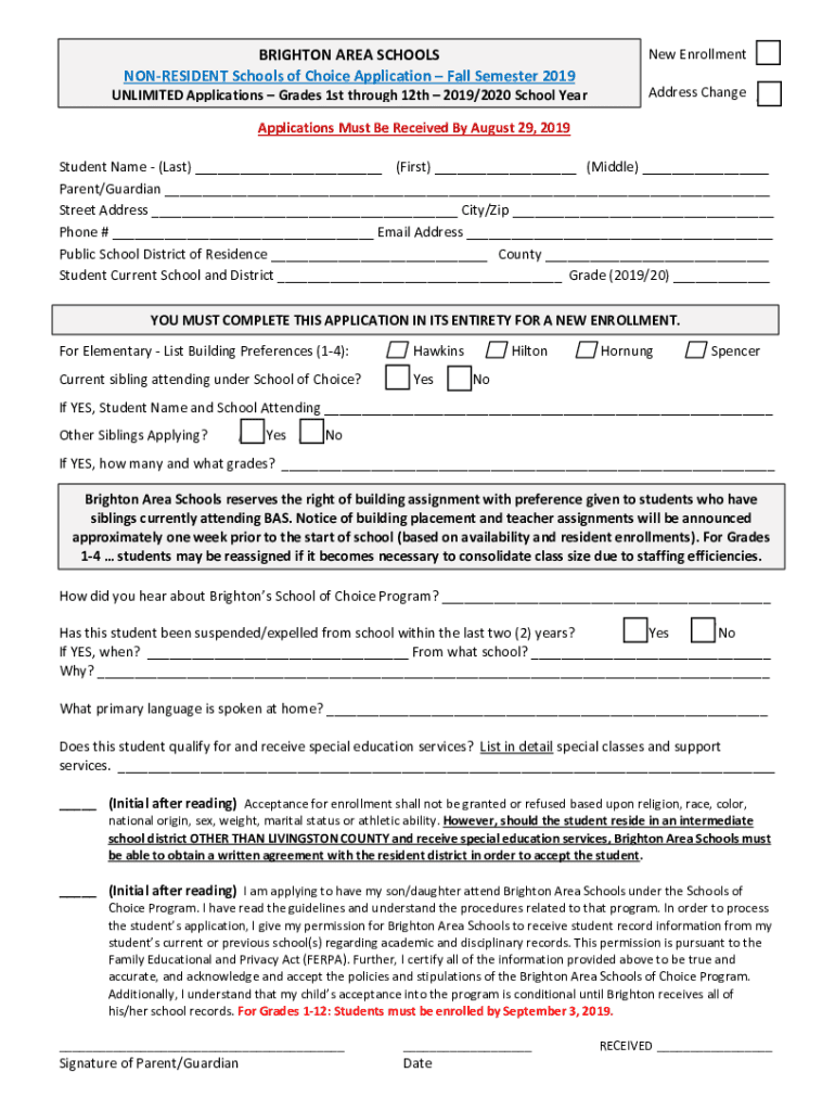 N BRIGHTON AREA SCHOOLS NONRESIDENT Schools of Choice Application Fall Semester 2019UNLIMITED Applications Grades 1st through 12th 2019/2020 School Yearned Enrollment Address ChangeApplications Must