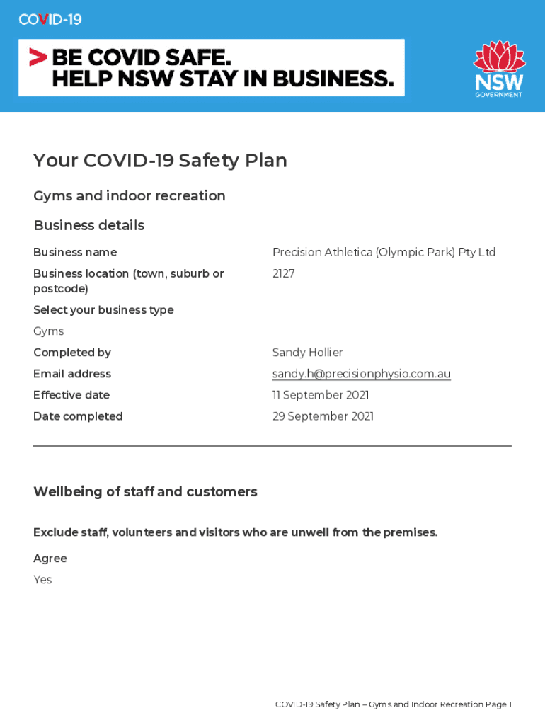Your COVID-19 Safety Plan Gyms and indoor recreation Business details Business imprecision Athletic (Olympic Park) Pty Business location (town, suburb or postcode)2127Select your business type Gyms