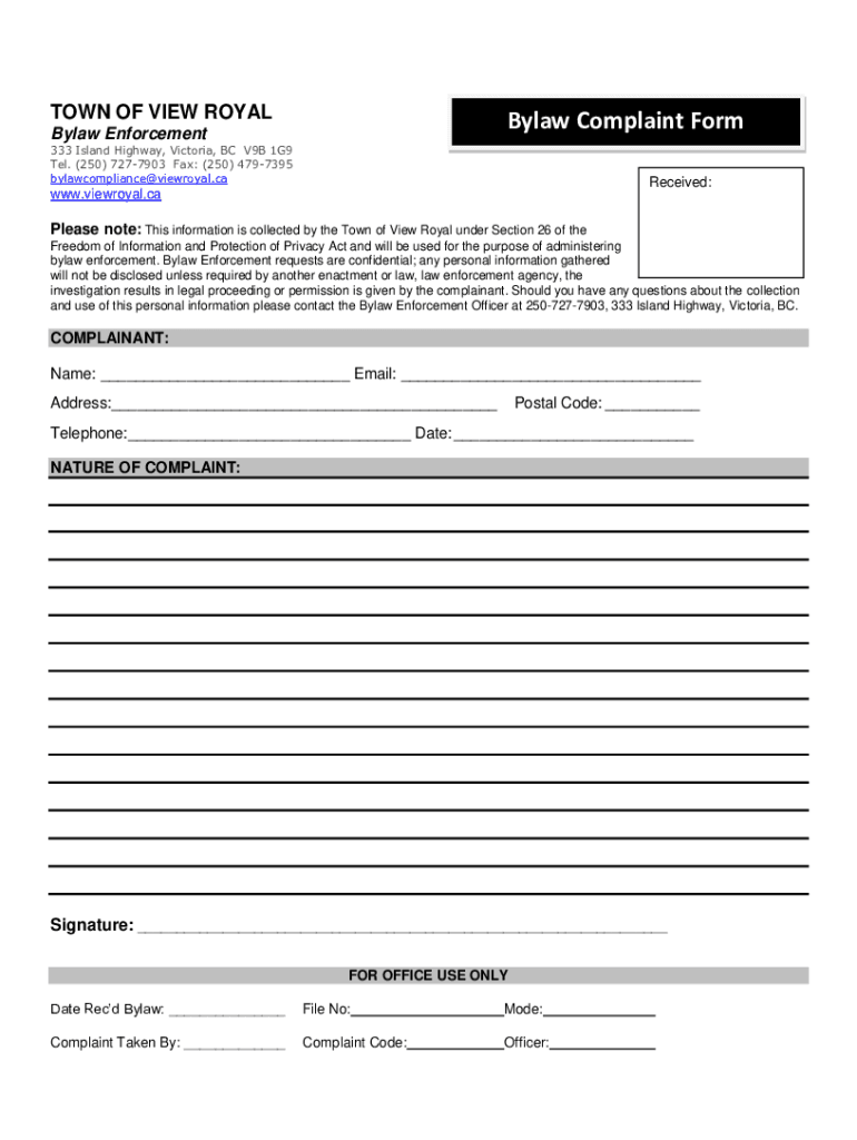 Get the free Bylaw Complaint Form - View Royal