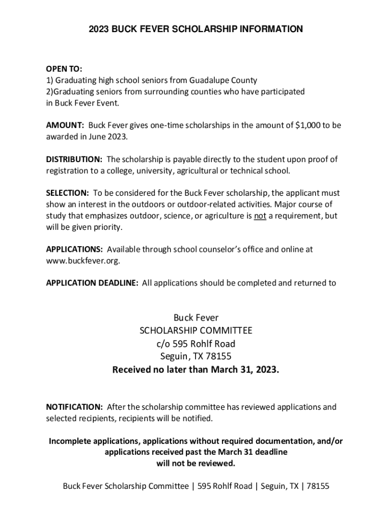 2023 BUCK FEVER SCHOLARSHIP INFORMATIONOPEN TO: 1) Graduating from high school seniors from Guadalupe County 2)Graduating seniors from surrounding counties who have participated in Buck Fever Event.