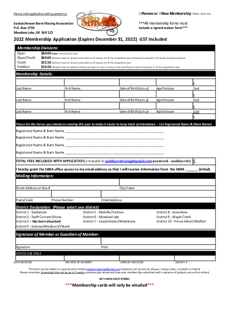 Please mail application with payment to:Renew or New Membership (Please check one)Saskatchewan Barrel Racing Association P.O. Box 1793 Meadow Lake, SK S9X 1Z2***All membership forms must include a