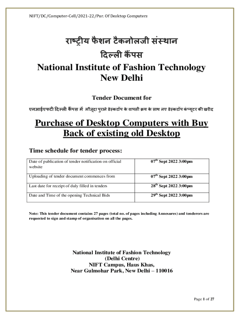 GIFT/DC/ComputerCell/202122/PUR. Of Desktop Computers National Institute of Fashion Technology New Delhi Tender Document for.