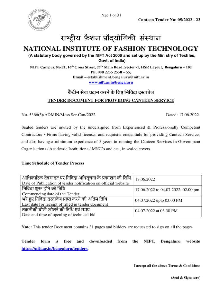 Page 1 of 31Canteen Tender No: 05/2022 23 NATIONAL Institutes OF FASHION TECHNOLOGY (A statutory body governed by the GIFT Act 2006 and set up by the Ministry of Textiles, Govt. of India) GIFT Campus,