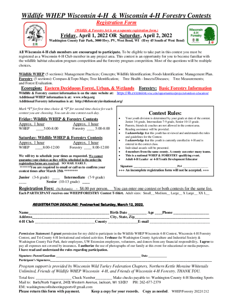 Wildlife WHEN Wisconsin 4H & Wisconsin 4H Forestry Contests Registration Form (Wildlife & Forestry Art is on a separate registration form.) Friday, April 1, 2022, OR Saturday, April 2, 2022, Washington