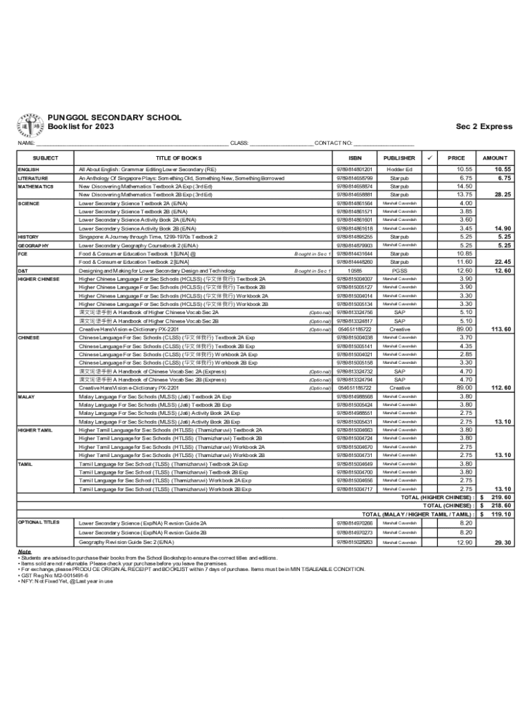 Book list for 2023Sec 2 Expressive: ___ CLASS: ___ CONTACT NO: ___