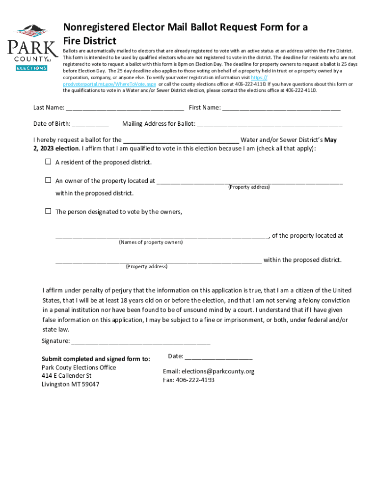Nonregistered Elector Mail Ballot Request Form for a Fire DistrictBallots are automatically mailed to electors that are already registered to vote with an active status at an address within the Fire