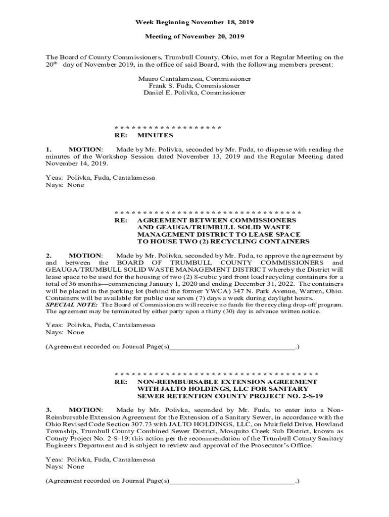 Week Beginning November 18, 2019, Meeting of November 20, 2019, The Board of County Commissioners, Trumbull County, Ohio, met for a Regular Meeting on the 20th day of November 2019, in the office