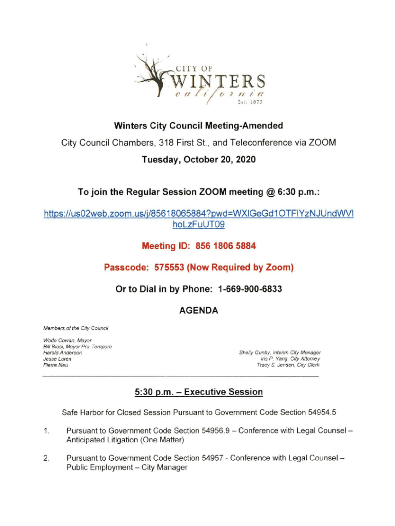 CITY FAI NF f/Est. 1875Winters City Council MeetingAmended City Council Chambers, 318 First St., and Teleconference via ZOOM Tuesday, October 20, 2020To join the Regular Session ZOOM meeting @ 6:30