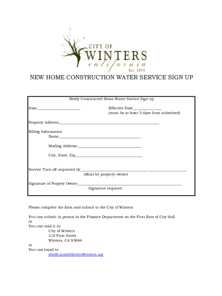 NEW HOME CONSTRUCTION WATER SERVICE SIGN Newly Constructed Home Water Service Sign up Date___Effective Date___ (must be at least 5 days from submitted)Property Address___ Billing Information Name___