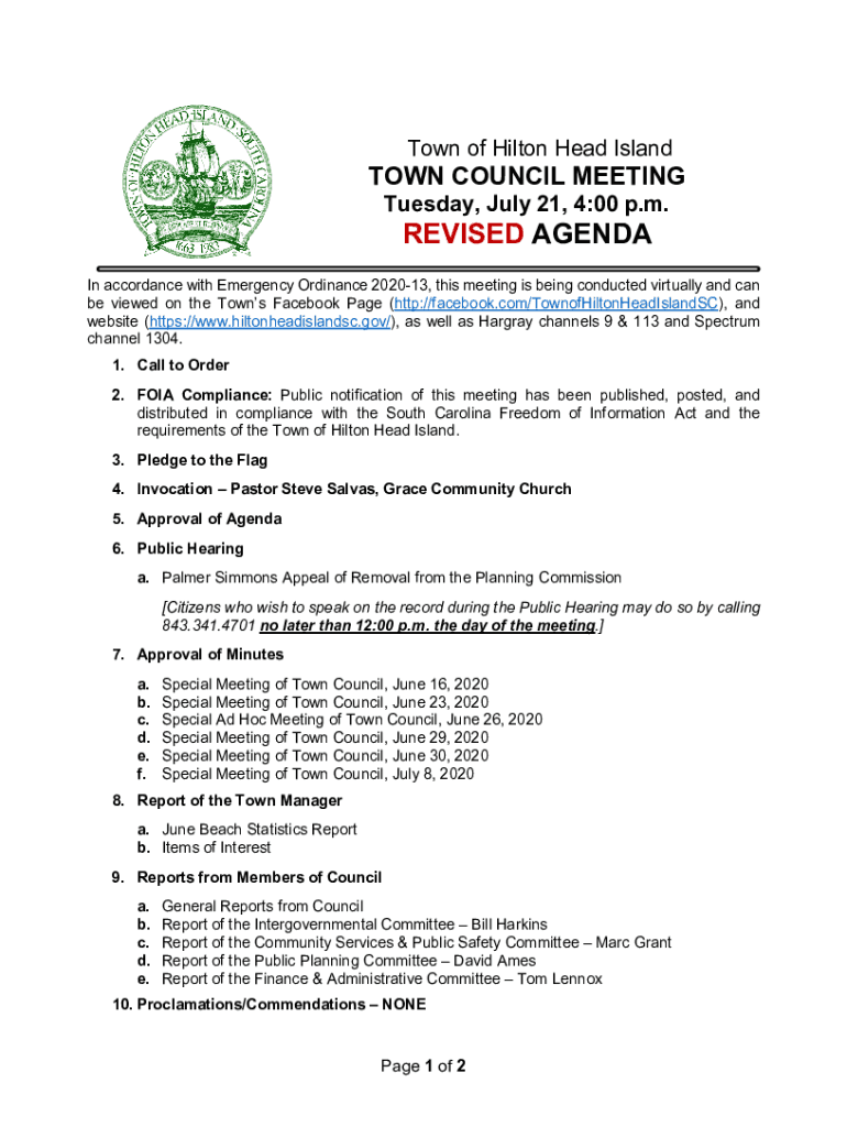 Town of Hilton Head IslandTOWN COUNCIL MEETING Tuesday, July 21, 4:00 p.m.REVISED AGENDA In accordance with Emergency Ordinance 202013, this meeting is being conducted virtually and can be viewed