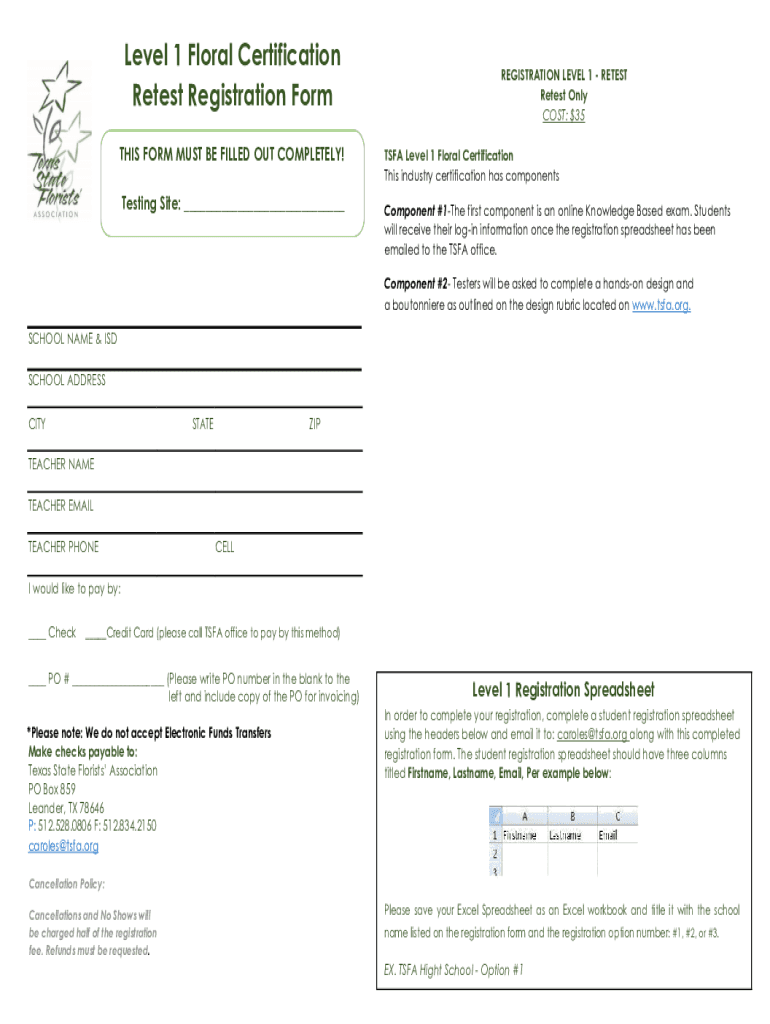 Level 1 Floral Certification Retest Registration Form THIS FORM MUST BE FILLED OUT COMPLETELY! Testing Site: ___REGISTRATION LEVEL 1 RETEST Only COST: $35 TSA Level 1 Floral Certification This industry