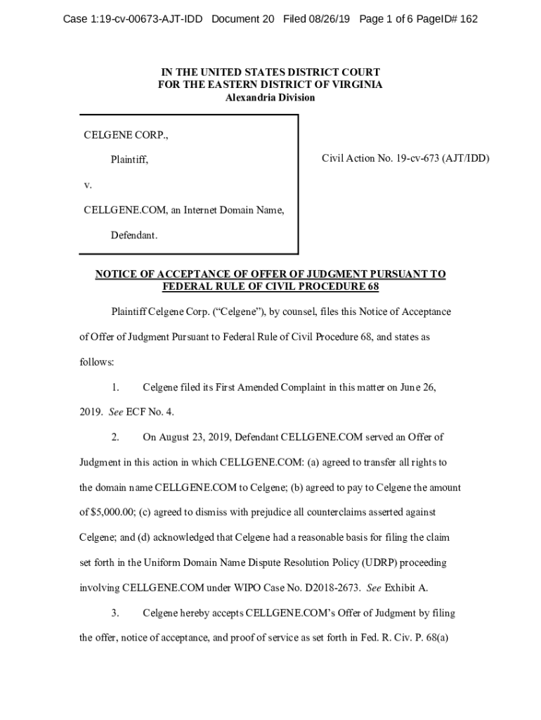 Case 1:19cv00673AJTIDD Document 20 Filed 08/26/19-Page 1 of 6 Paged# 162IN THE UNITED STATES DISTRICT COURT FOR THE EASTERN DISTRICT OF VIRGINIA Alexandria Division CELGENE CORP., Plaintiff, Civil