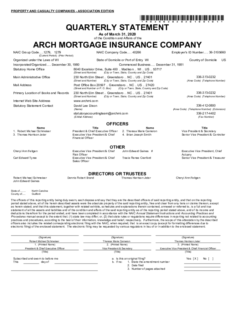 PROPERTY AND CASUALTY COMPANIES ASSOCIATION EDITION×40266202020100101×QUARTERLY STATEMENT As of March 31, 2020, of the Condition and Affairs of search MORTGAGE INSURANCE COMPANY NAIL Group Code.....1279,