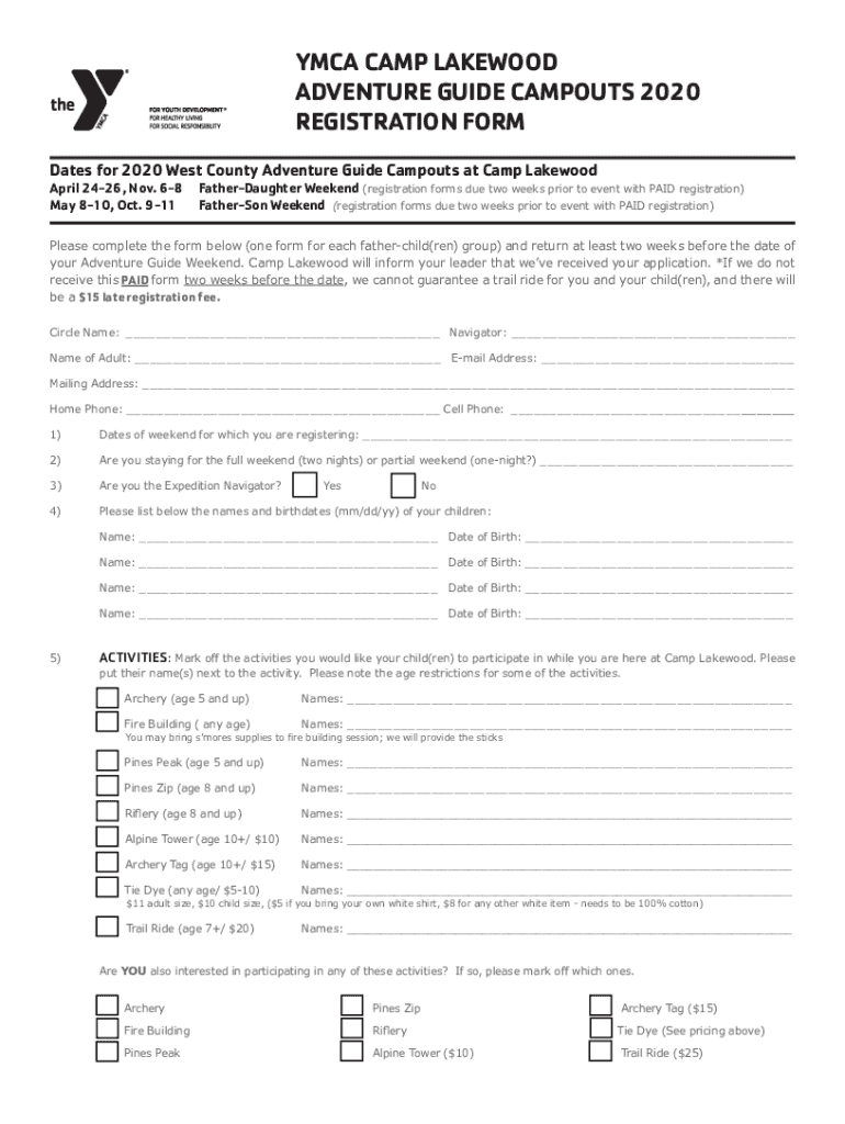 YMCA CAMP LAKEWOOD ADVENTURE GUIDE CAMPOUTS 2020 REGISTRATION FORM Dates for 2020 West County Adventure Guide Campouts at Camp Lakewood April 2426, Nov. 68FatherDaughter Weekend (registration forms