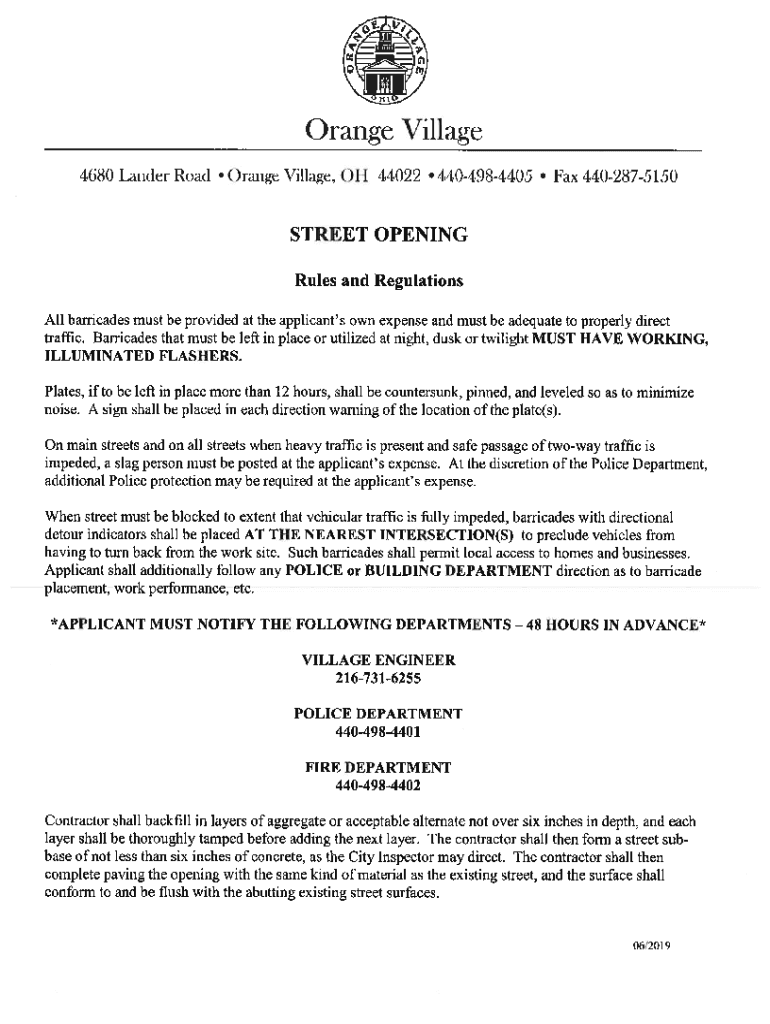 Orange Village 468() Lander Road Orange Village, OH 44022 4404984405Fax 440287515()STREET OPENING Rules and Regulations All barricades must be provided at the applicants own expense and must be adequate