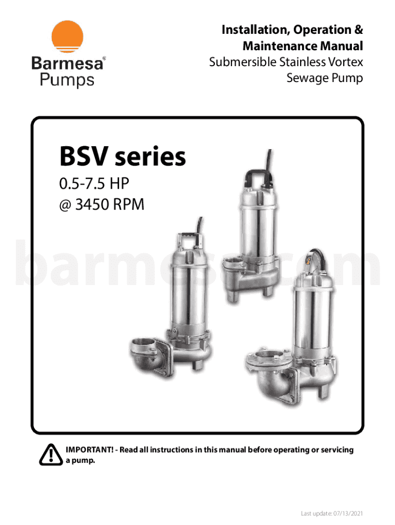 Installation, Operation & Maintenance Manual Submersible Stainless Vortex Sewage Pump BSV series 0.57.5 HP @ 3450 RPMbarmesa.com IMPORTANT! Read all instructions in this manual before operating or