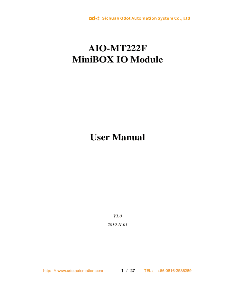 AIOMT222F MiniBOX IO Modules ManualV1.0 2019.11.01http// www.odotautomation.com1 / 27TEL +8608162538289MODBUS 16 channels digital output module Sichuan Dot Automation System Co., Ltd 20196 Copyright2010