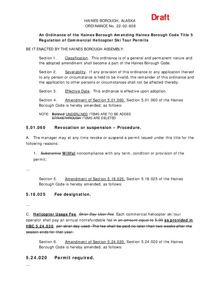 HAINES BOROUGH, ALASKA ORDINANCE No. 2202608DraftAn Ordinance of the Haines Borough Amending Haines Borough Code Title 5 Regulation of Commercial Helicopter Ski Tour Permits BE IT ENACTED BY THE HAINES