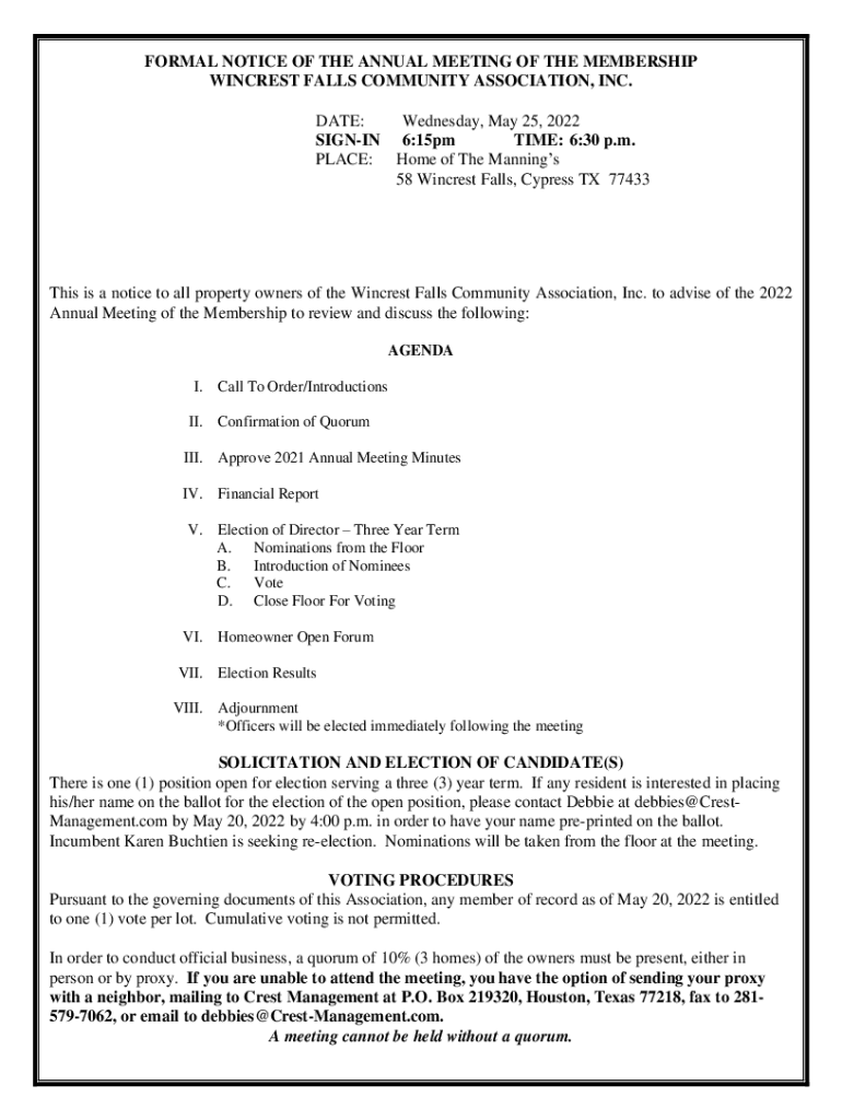 FORMAL NOTICE OF THE ANNUAL MEETING OF THE MEMBERSHIP WINCHES FALLS COMMUNITY ASSOCIATION, INC. DATE: Wednesday, May 25, 2022, SIGNING 6:15pm TIME: 6:30 p.m. PLACE: Home of The Manning's 58 Win crest