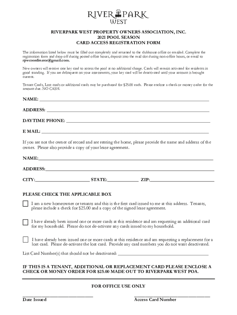 RIVERBANK WEST PROPERTY OWNERS ASSOCIATION, INC. 2021 POOL SEASON CARD ACCESS REGISTRATION From The information listed below must be filled out completely and returned to the clubhouse office or emailed.