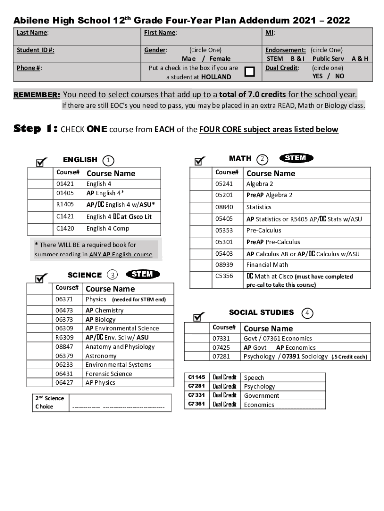 Get the free Abilene High School 12th Grade Four-Year Plan Addendum ...