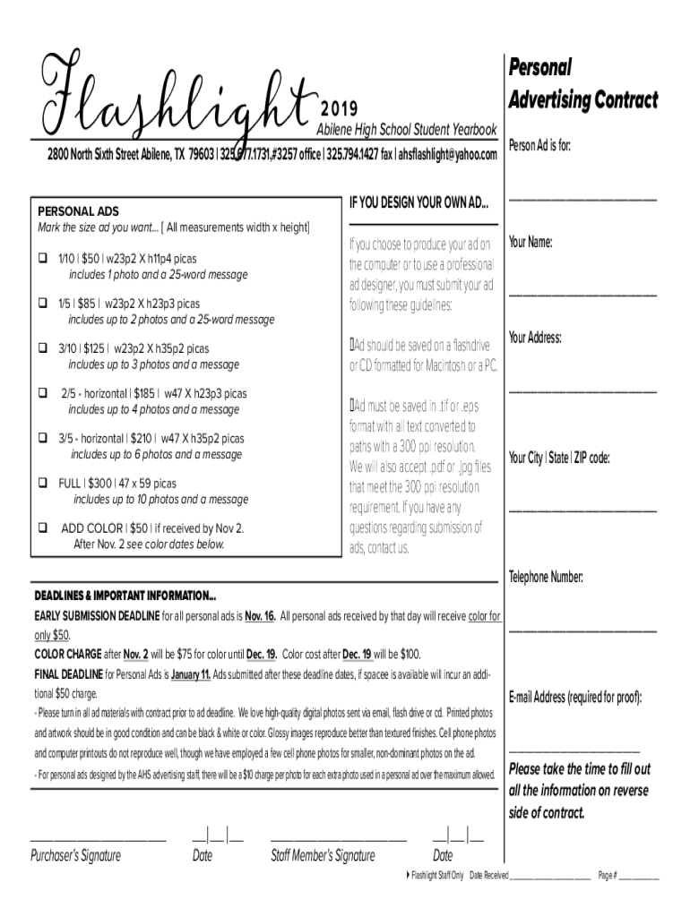 Flashlight2019Abilene High School Student Yearbook 2800 North Sixth Street Abilene, TX 79603 | 325.677.1731,#3257 office | 325.794.1427 fax | ahsflashlight@yahoo.comPERSONAL ADS Mark the size ad you